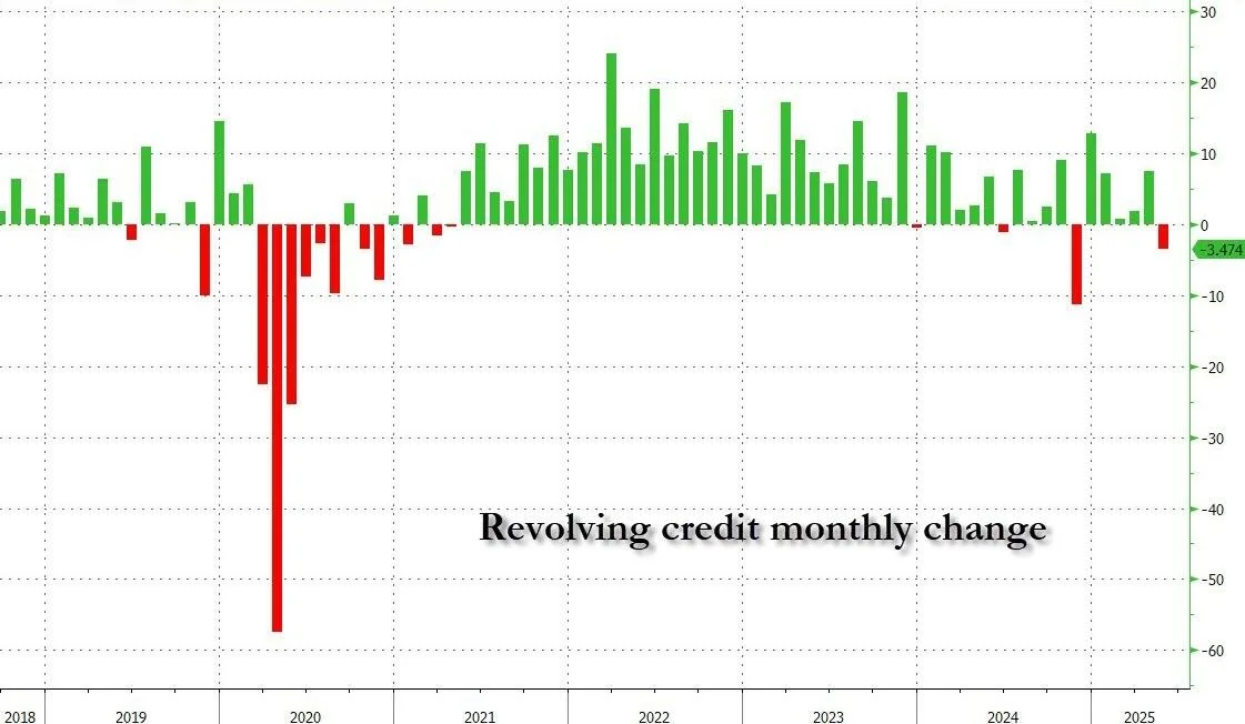 Economy watchers are seeking to determine the cause of a rapid fall in US revolving credit (i.e. credit cards). Is the US consumer finally tapped out after years of spending past its means? Is higher interest rates finally making an impact? Are US consumers buying less in the face of higher prices from tariffs? Did all the macro uncertainty YTD make a tangible dent on consumer behavior? Or is the drop just a statistical aberration that will rapidly reverse itself into more buying of more stuff?