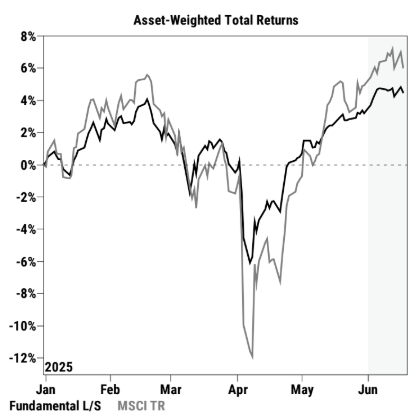 Equity Long/Short strategies experienced their peak YTD MSCI World outperformance moment in early April. The start of the year featured a small lag in Equity Long/ Short performance versus the MSCI World, but since May this gap has widened due to shorts dragging down profitability amid persistent buying pressures by US retail investors of overvalued stocks.